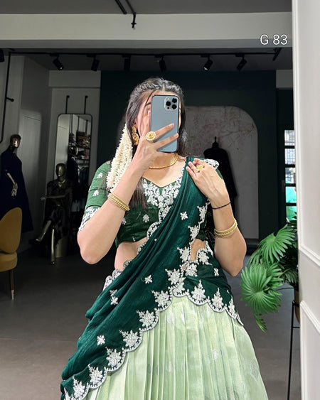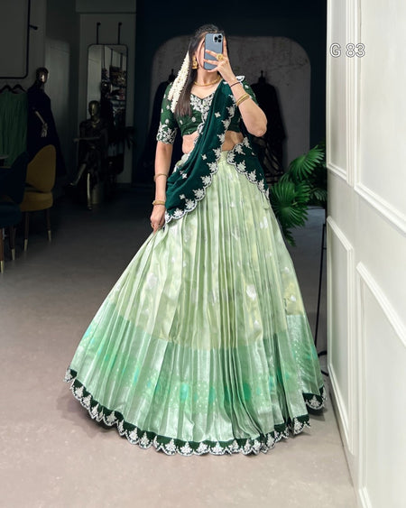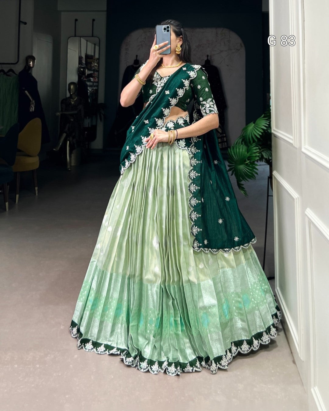 Zari Kota Lehenga with Sequins & Thread Embroidery Scallop Lace Border – G 83 Pista